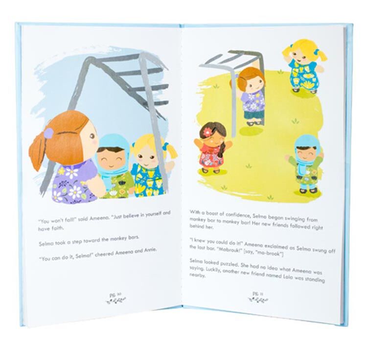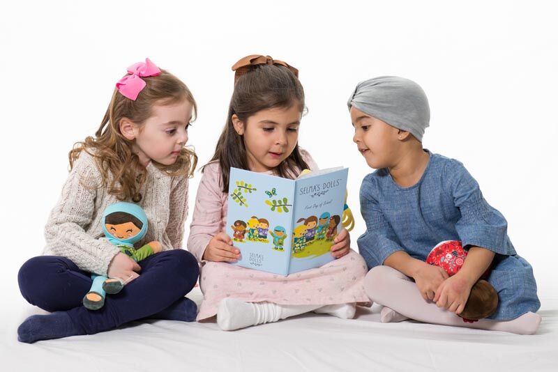 Accompanying every doll is a sweetly illustrated storybook titled First Day of School. The18-page hardback book features a little girl named Selma –the inspiration behind Selma’s Dolls– who overcomes her first day of school jitters with the help of some new friends. Each friend is able to teach Selma something beautiful and help Selma see that we are all much more the same than we are different. The book includes conversation starters to help parents and caregivers talk with their child about how everyone’s differences are beautiful.
