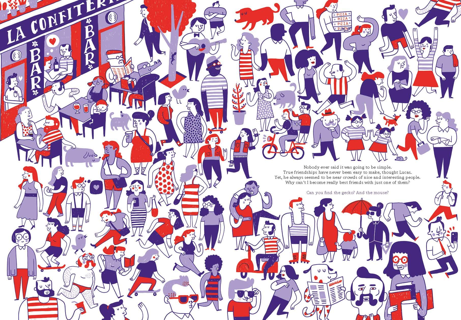 Lucas is looking everywhere for a best friend: the park, the circus, by the lake, and at school. He meets a lot of people along the way. But what about a best friend? This entertaining and colorful book is full of details for kids to search and find. Every spread features line drawings that are humming with activity. From an animal hospital populated with every kind of pet to an office filled with workers too busy working to give Lucas the time of day; from a restaurant that appears to serve only sandwiches and salad to a botanic garden where the visitors are just as strange as the plants.
