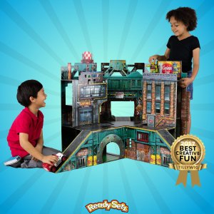 Readysetz come fully assembled, the refreshed artwork of an urban landscape is now available in two sizes. Already a four-time toy industry winner, the next generation Urban Playset includes fun add-ons like crate boxes and stickers plus catwalk feature!