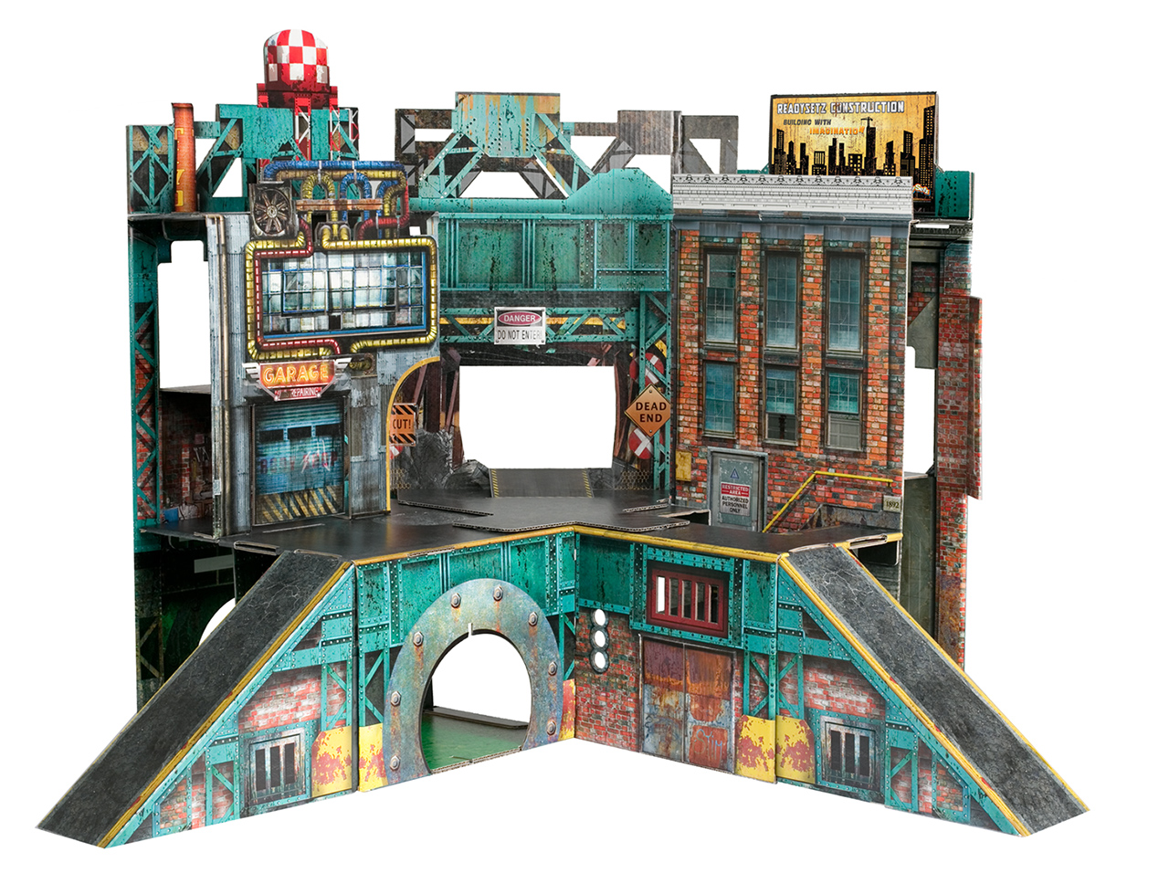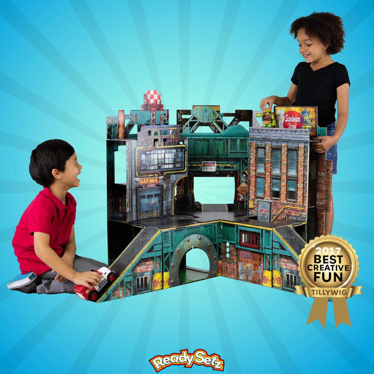 Readysetz come fully assembled, the refreshed artwork of an urban landscape is now available in two sizes. Already a four-time toy industry winner, the next generation Urban Playset includes fun add-ons like crate boxes and stickers plus catwalk feature!