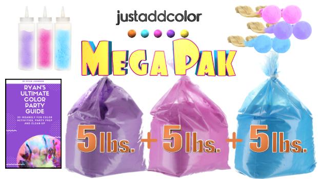 The Just Add Color Mega Pak includes everything you need to add colorful powder games, color dances, color crafts, color photos and color experiences to your next party. Every party is more fun with color…birthday parties, half-birthday parties, church parties, team banquets, surprise parties, graduation parties, gender reveal parties to name a few. Simply put, The Just Add Color Mega Pak gives you color, tools and a how-to guide to make your next party 10 Times More Fun.